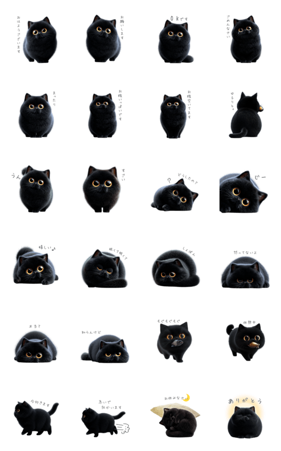 猫の表情を主役にした、大人なシンプルスタンプなので使いやすく、 黒猫の愛くるしい魅力をお届け。お友達同士はもちろん、年上の方への返信にも。