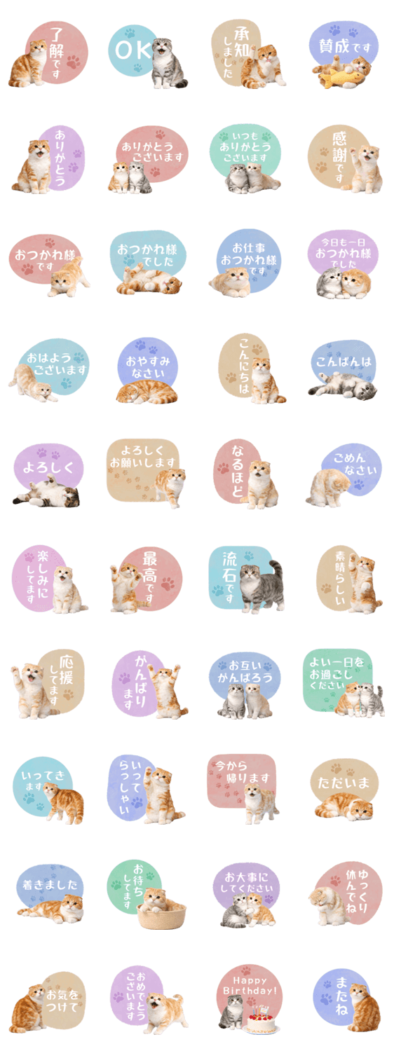丁寧な言葉で大人の会話に寄り添う、毎日使えるスコティッシュフォールドのスタンプです。