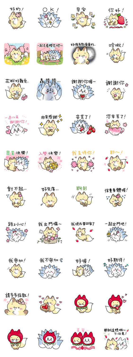 Chinese (Traditional)。台湾華語のキツネのこんこんと九尾の狐の春を感じるスタンプです。花粉症、いちご、お花見、日常など。
