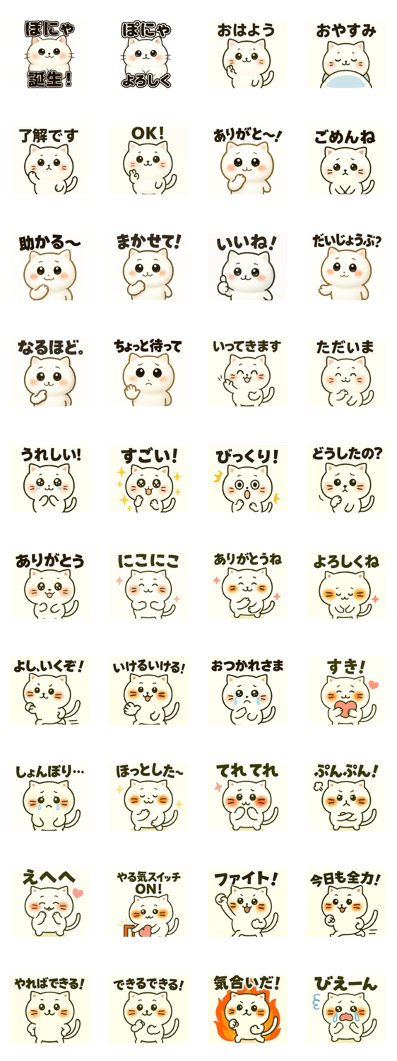 まるくて白いネコ「ぽにゃ」の、毎日つかえる日常&応援スタンプです。ありがとう・了解・がんばるぞ!など、使いやすい言葉がたっぷり。