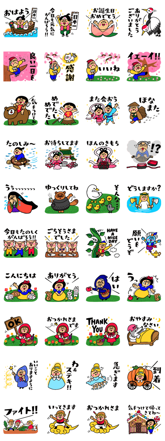 挨拶をはじめ、毎日使える愉快で元気な昔ばなしスタンプ集第2弾!(浦島太郎/桃太郎/金太郎/かぐや姫/花咲か爺さん/赤ずきん/白雪姫/シンデレラ/ピーターパン/童話/昔話)