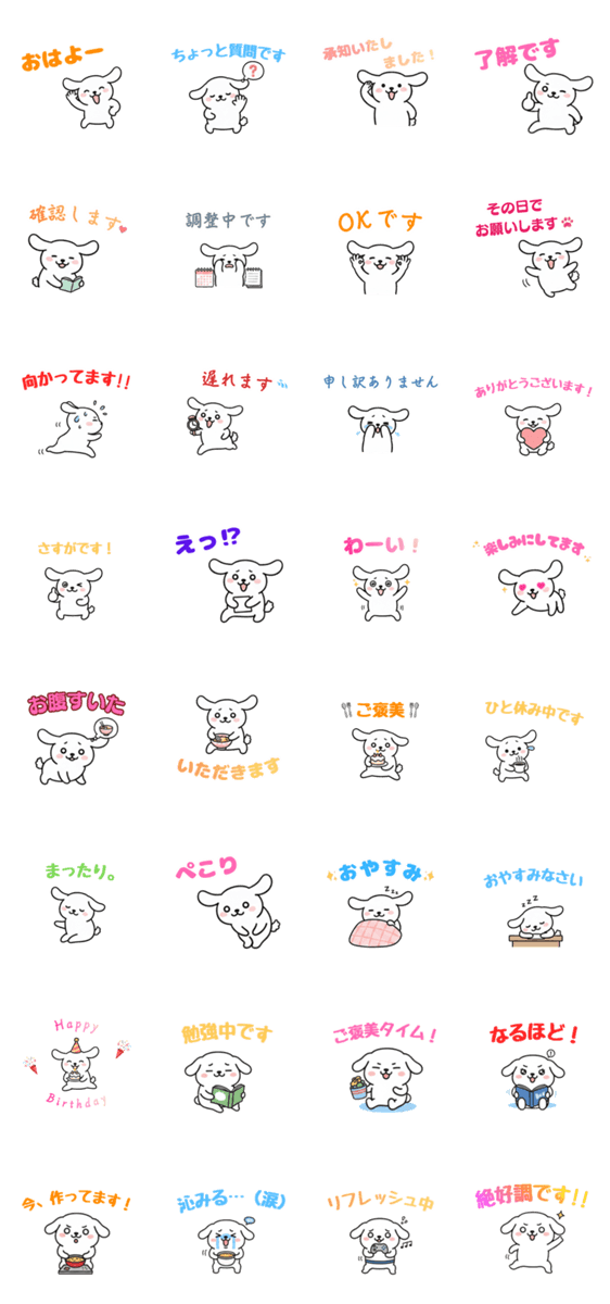 忙しい働く女性のための、ゆるくて可愛い白い犬です。敬語でのスケジュール調整から毎日の「お疲れ様」まで、仕事でもプライベートでも使いやすい内容を揃えました。