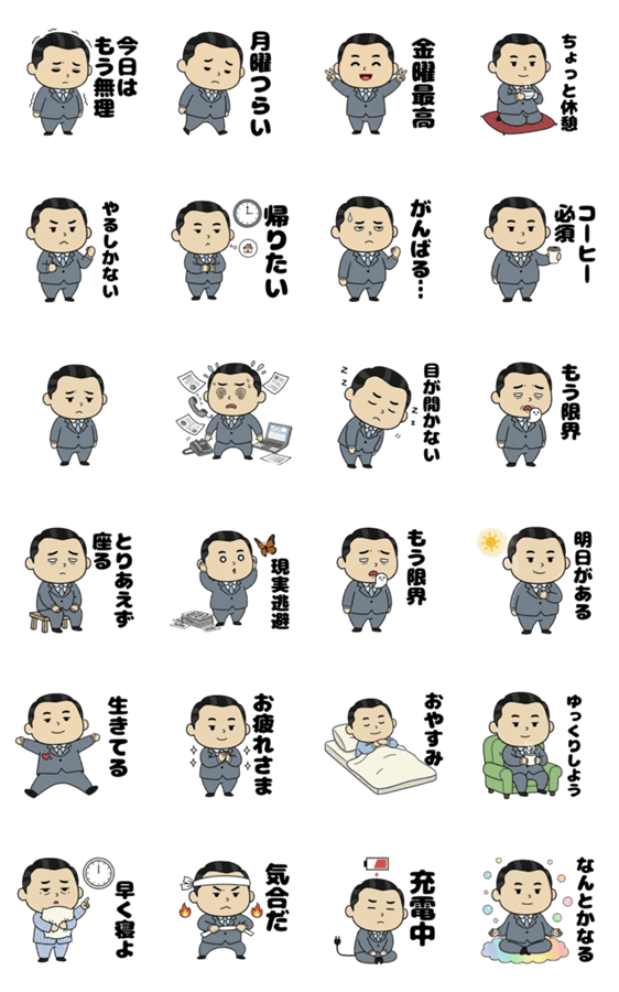 ちょっと疲れたお父さんの共感スタンプ第3弾。 仕事の合間や帰宅前に使いやすい、ゆるネタ多めの24個セットです。