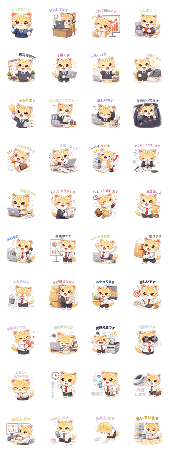 大人も使いやすい、毎日使える仕事ゆるにゃんスタンプ。やさしい表情とシンプルデザインで、職場・友達・家族とのトークにぴったり。敬語も使えて安心♪