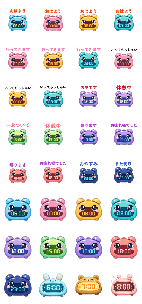 朝の「おはよう」から夜の「おやすみ」まで、時間で気持ちが伝わる時計スタンプ。文字なしタイプも入っているので、どんな相手にも使いやすいセットです。