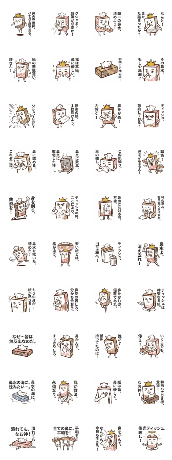 ティッシュ箱が神格化したハナガミ様。自らを削り鼻水から救う尊大な姿が、花粉の季節や風邪の毎日の連絡、体調を気遣う返信に役立ちます。