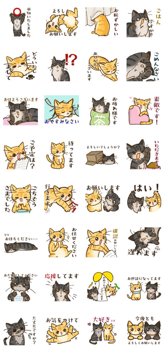 誰でも使いやすい、我が家の保護猫ちゃんのスタンプ敬語バージョンです♪ 家族や友達、ビジネスの場でも使えます! キジトラ:るぅ 茶トラ:ちゃちゃまる