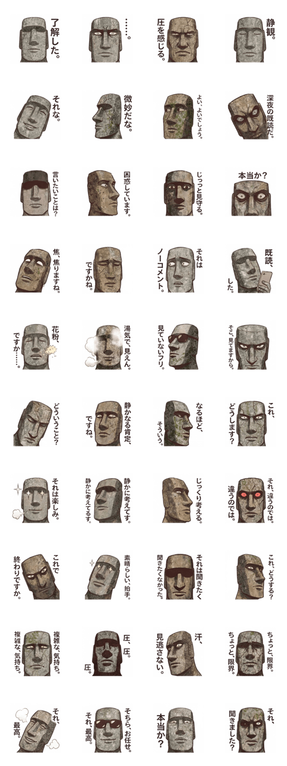 石像のモアイが日常に圧をかけるスタンプ。つよくつよく圧を掛けたいときに。仕事や友達への返信に。石像ならではの圧を。