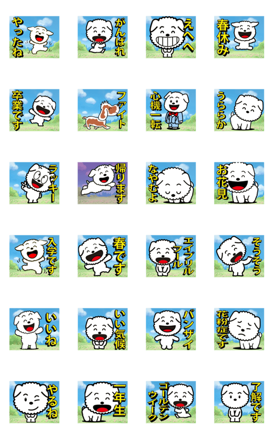 楽しいアニメスタンプです。春の野原での子犬のアニメスタンプです。