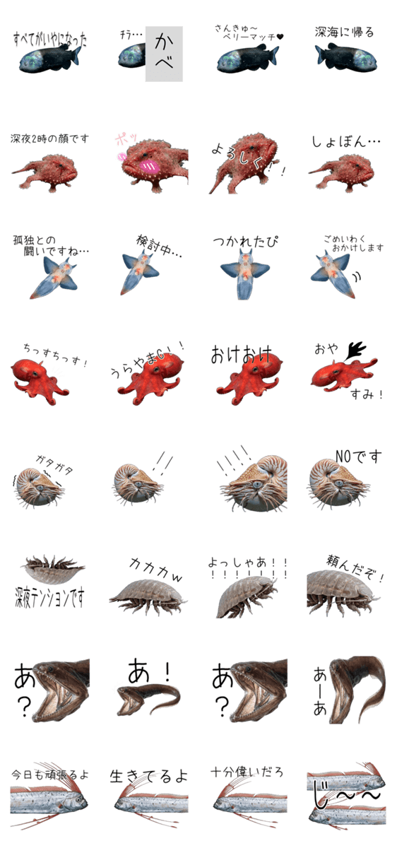 毎日を一生懸命生きる、個性豊かな深海魚たちのスタンプです。