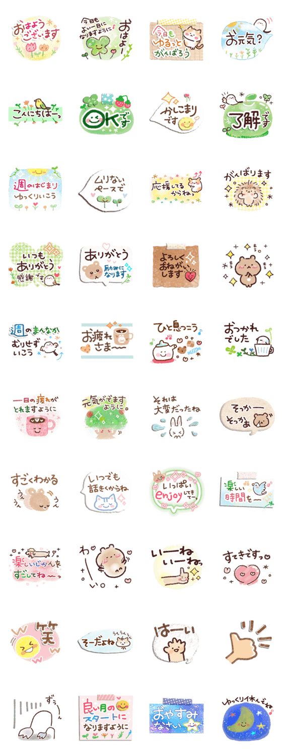 大人が使いやすい、やさしい応援スタンプ。 毎日の会話にそっと寄り添う言葉を集めました。よく使う日常挨拶も入ったセットです。
