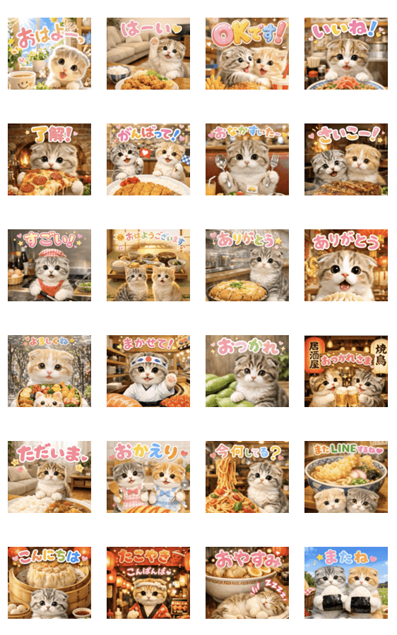 美味しいごはんと一緒ににゃんこ達が日常の挨拶をお届けします♡画面いっぱいに飛び出して動くポップアップスタンプです。