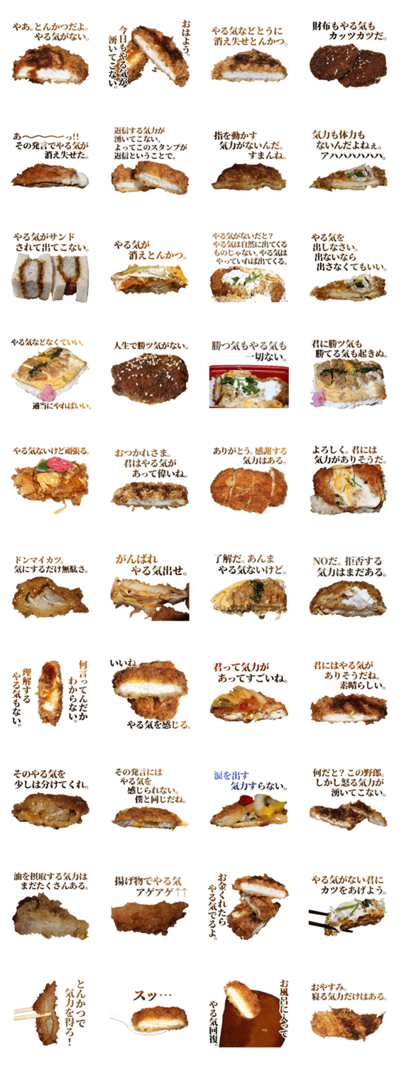 トンカツの、やる気のない、無気力なスタンプです。揚げ物、飯テロ、カツ丼、豚肉、フライ、モチベーション、ネタ、豚カツ、気力なし。実写食べ物面白スタンプシリーズ。
