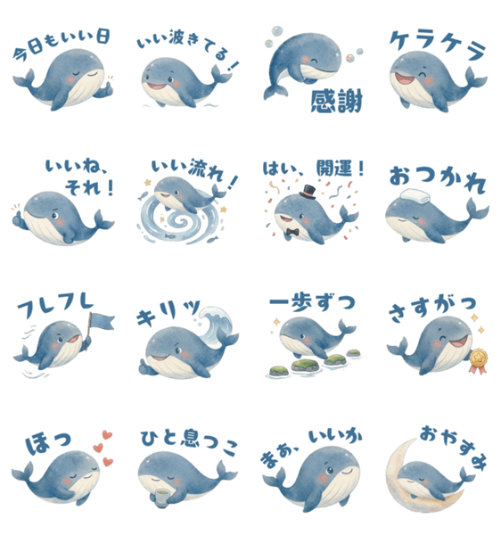 ちょっと肩の力を抜きたいときに。 ご機嫌なクジラが、やさしく寄り添います。 日常で使える言葉に、 ふわっと前向きになれるニュアンスをのせて。 ゆるく、いい流れで。