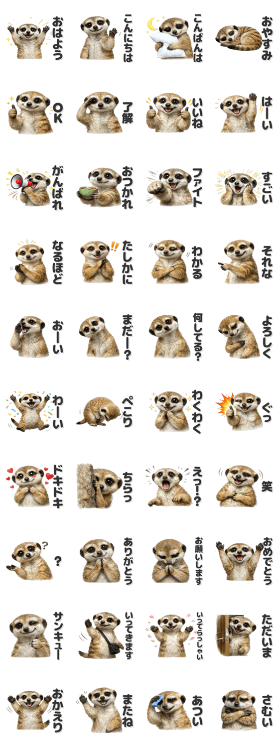 可愛いミーアキャットのスタンプです。/動物/どうぶつ/小動物/かわいい/可愛い/いやし/日常/家族/友達/返事/見やすい/便利/シンプル