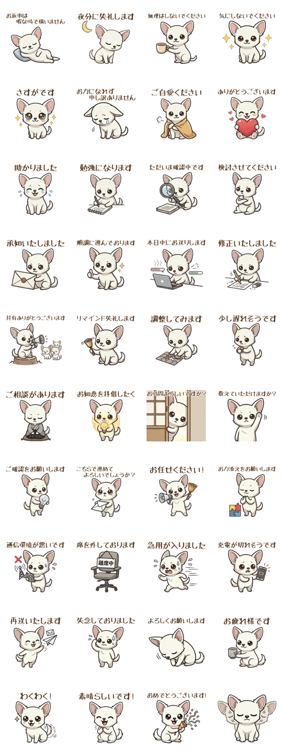 可愛い白いチワワのスタンプです。第2弾で仕事のチャットをレベルアップ!素早い返信にぴったりです。あなたのプロフェッショナルな生活をよりスムーズにしてくれます。