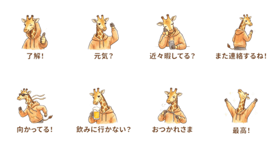 オレンジパーカーの陽気なキリンが登場!毎日のやり取りに便利な挨拶を揃えました。水彩風の優しいタッチとポップな表情で、トークを明るく盛り上げます。