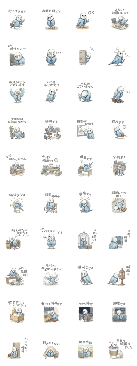 過酷な社会をなんとかやり過ごす勤労インコ第2弾。出勤から帰宅まで、働く人のリアルでじわっとくる感情を届ける業務連絡系スタンプです。今日もどうにか乗り切る!