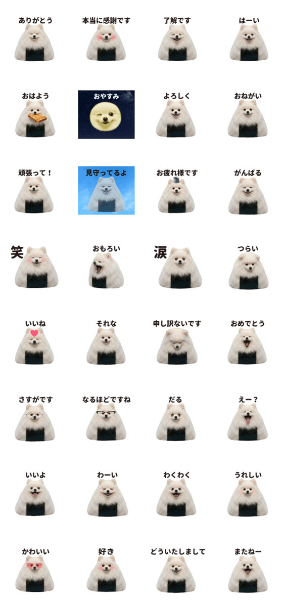 おにぎりのポメラニアンです。毎日使える言葉を集めました。友達や家族などの会話に。 (ポメラニアン,犬,おにぎり,おむすび)