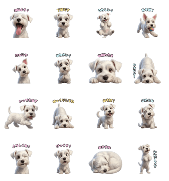 シュナウザーの豊かな表情やしぐさを描いた、日常で使いやすいスタンプ。 挨拶から喜怒哀楽まで、豊富なバリエーションでトークを楽しく彩ります。 自分用にも贈り物にも!