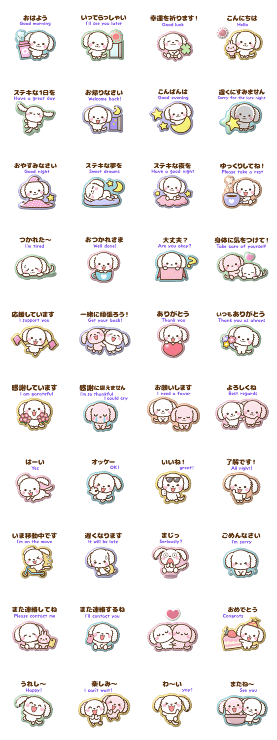 | スタンプ説明 | ティーカッププードルの「ぷっくりシール風スタンプ」です♪ 「日本語&英語」版でよく使う言葉を集めました♫ |