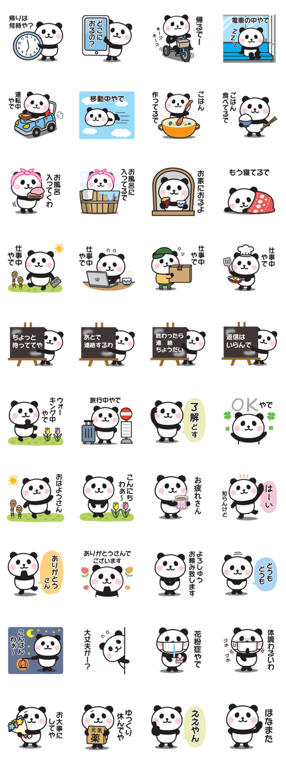 可愛いパンダさんの家族や恋人、友達等の連絡用に使える言葉を集めたとっても使いやすい関西弁スタンプです♪