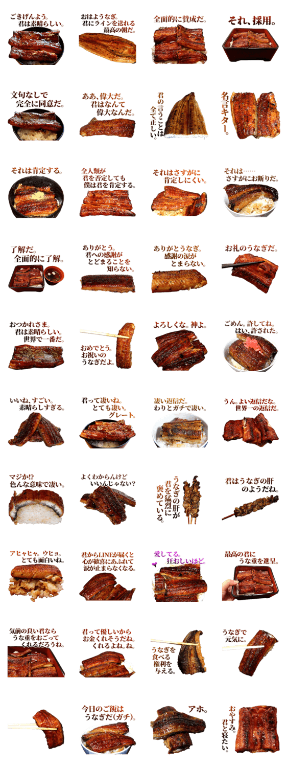 うなぎが相手のすべてを肯定するスタンプです。肯定はうな重並みの最強コミュニケーション。ウナギ、鰻、うな丼、蒲焼き、土用の丑の日。実写食べ物スタンプシリーズ。