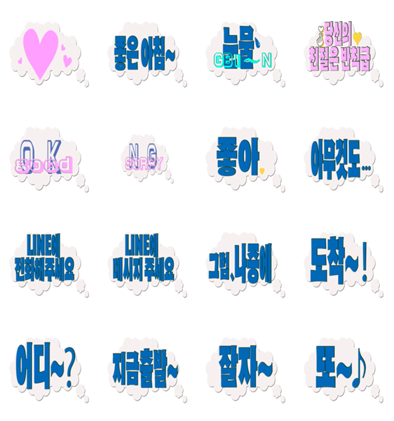 他のキャラクターや、吹き出しともアレンジできるかわいい雲型のスタンプです♪基本的な単語のみにしました。