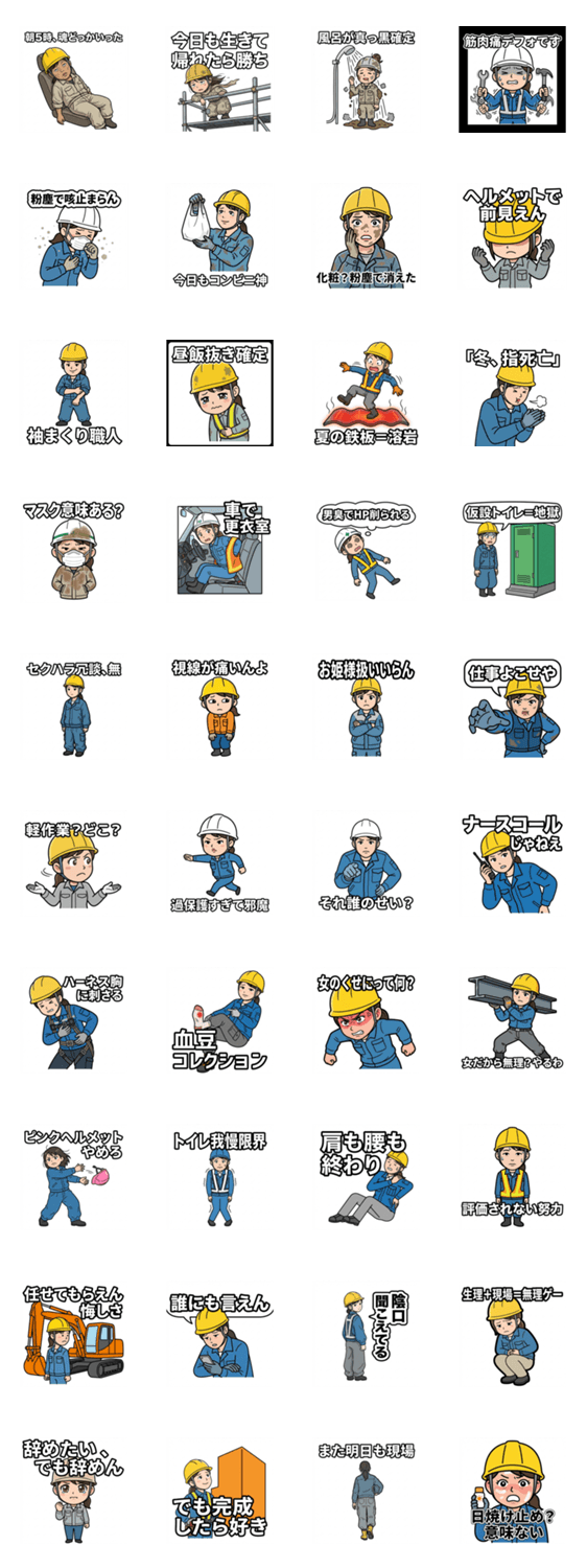 建設現場で働く女性のリアルな日常スタンプ。 朝5時の絶望、粉塵、筋肉痛などあるある満載。 仕事仲間や友達との会話で使いやすく、共感できる内容です。