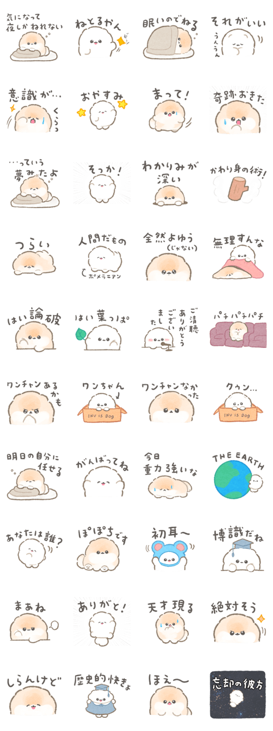 眠い、つらい、人間だもの。無理せず生きたいすべての現代人に贈る、ポメラニアン「ぽぽち」のゆるふわスタンプ。