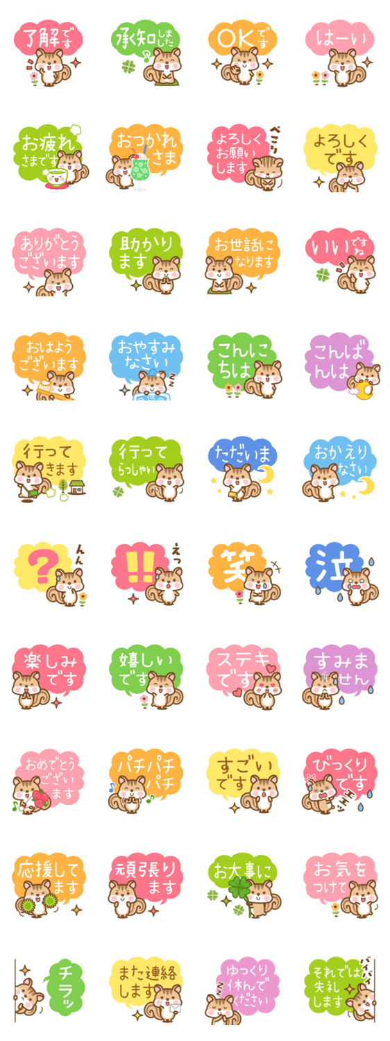 シマリスの「シマリさん」のシンプルな敬語スタンプ第7弾です。今回は、大きな文字で見やすく、日常で使いやすい、ふきだしスタンプです。