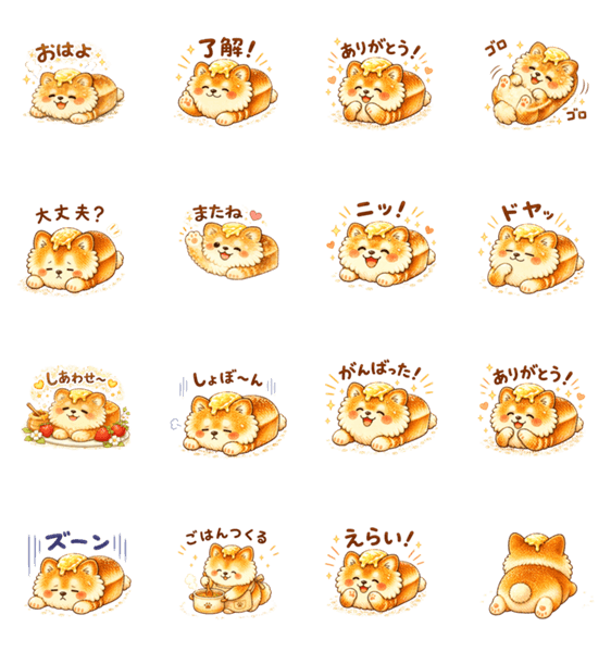 ゆるくてとけちゃうパン✖️ポメラニアンのスタンプ。 毎日使える「おはよ」「ありがとう」から、 「むり…」「だるい」まで気持ちをやさしく伝えます。