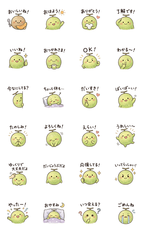 まんまるメロンのキャラクターが、日常のあいさつや気持ちを表現!毎日使えるセリフが24種類。ゆるかわいいメロンちゃんと一緒に、トークをもっと楽しく♪