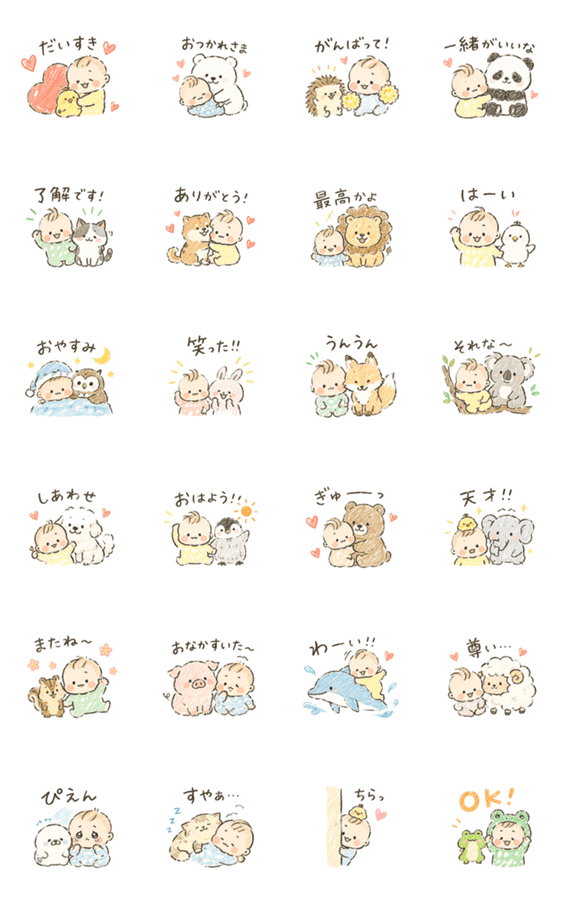 へたうまでゆるかわな赤ちゃんとどうぶつたちのスタンプです! 「おはよう」「ありがとう」「OK」など、毎日使える言葉をたっぷり収録!