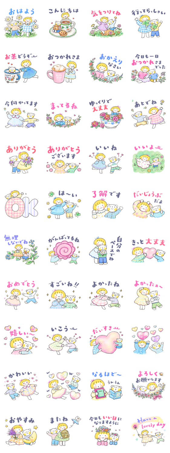 やさしい気持ちを届けるスタンプです。「おはよう」「ありがとう」など毎日使える言葉と、ほっとするやりとりを詰め込みました。家族や友だちとの会話に♡