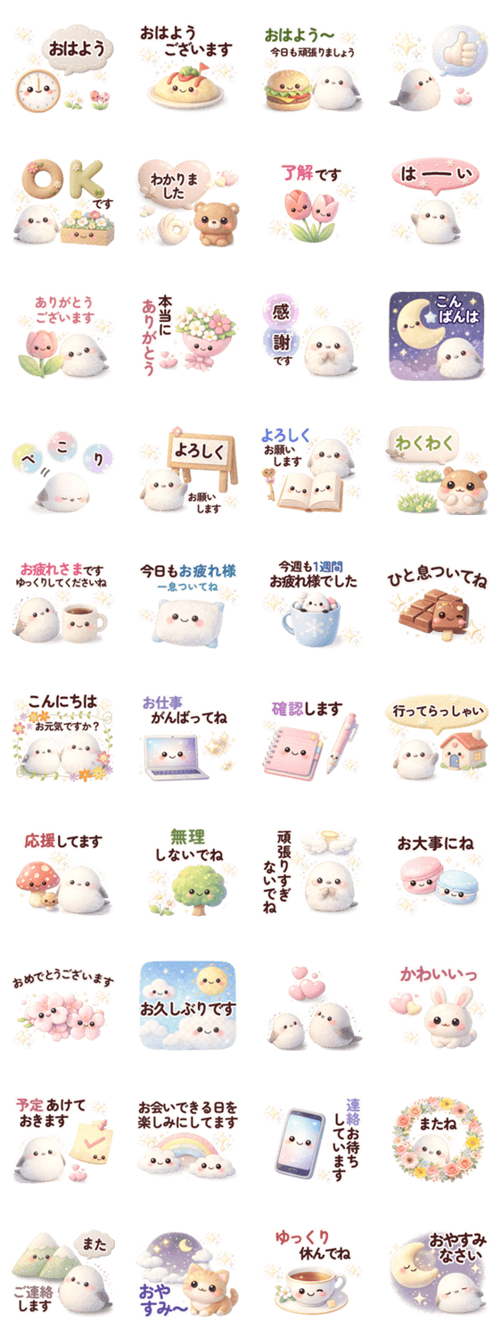 ほわほわで癒されるシマエナガのスタンプ♪大人かわいい優しいデザインで、挨拶・お仕事・日常会話まで毎日使いやすい内容です♡ゆるっと気持ちを伝えたいときにぴったり!
