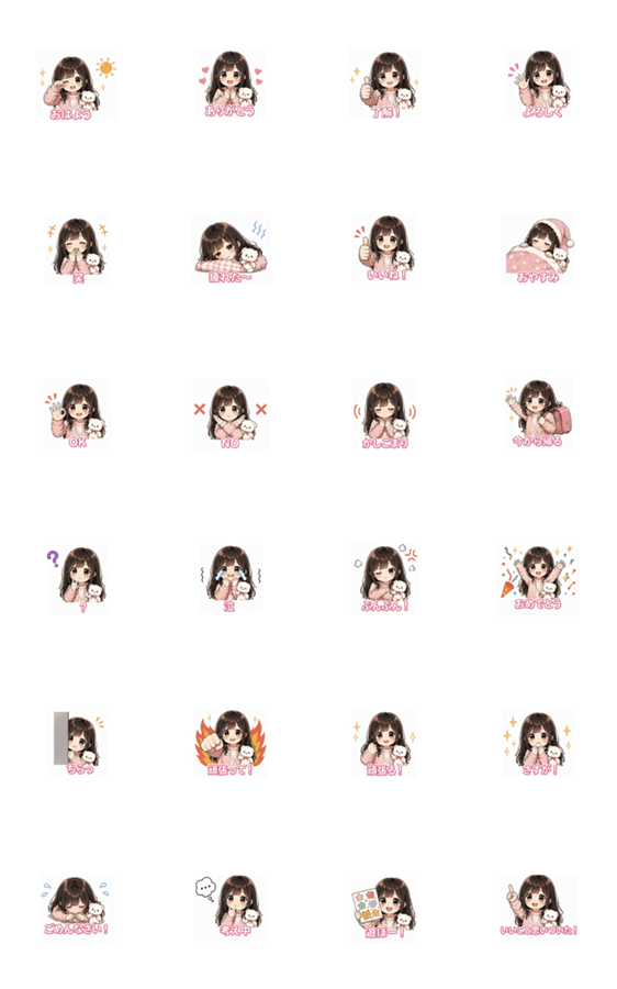 A cute anime girl in a pink knit sweater with her fluffy bear bag. 25 stickers for everyday conversations from good morning to let's play!