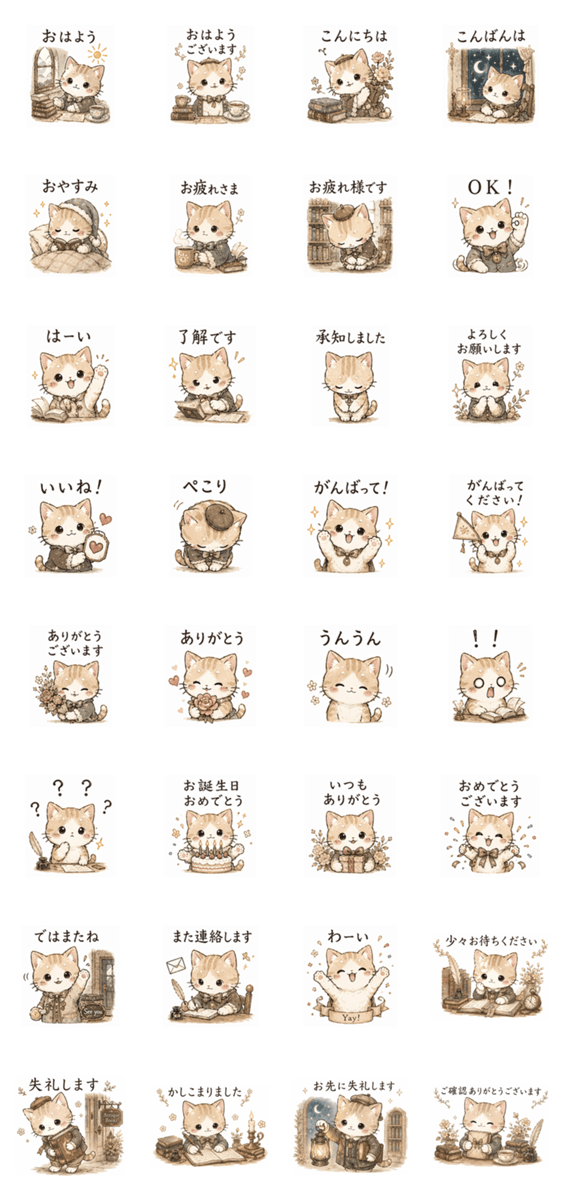 古書店で暮らす看板猫の、やさしい日常スタンプです。 アンティークな雰囲気で、大人かわいく仕上げました。 丁寧な言葉づかいで、日常のLINEにそっと寄り添います。