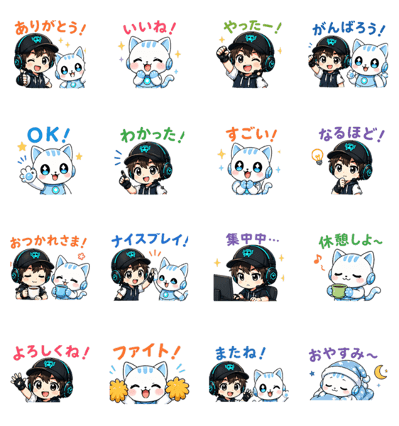 ゲーマー少年ネオくんと白猫ラミィの16個セット。eスポーツ好き・親子の日常に。「ナイスプレイ!」「集中中…」などゲーム場面にも。ブログ「eスポーツまなびラボ」公式。