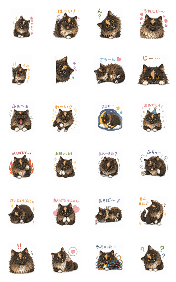 もふもふのサビ猫「らいか」のスタンプです。うれしい・ねむい・やる気満々など、日常のいろんな気持ちを代わりに伝えてくれます。