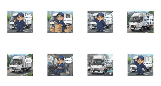 | スタンプ説明 | トラック運転手の日常生活のLINEスタンプです。主に2トントラックを乗って荷下ろしや渋滞、出勤、退勤などのドライバーの為に使えます。 |
