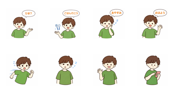 あいさつや眠そうな表情、友達との何気ない会話に使える、やさしい男の子の日常スタンプです。
