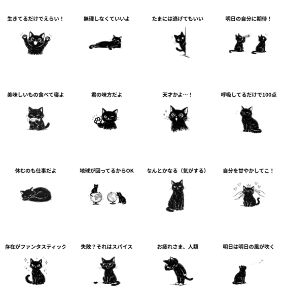「生きてるだけでえらい!」手書き風のゆるい黒猫が、あなたをそっと、そしてユーモアたっぷりに励まします。