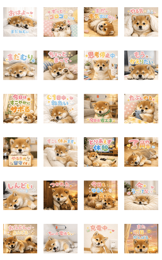 やる気のない可愛い柴犬が画面いっぱいに飛び出して動くポップアップスタンプです。
