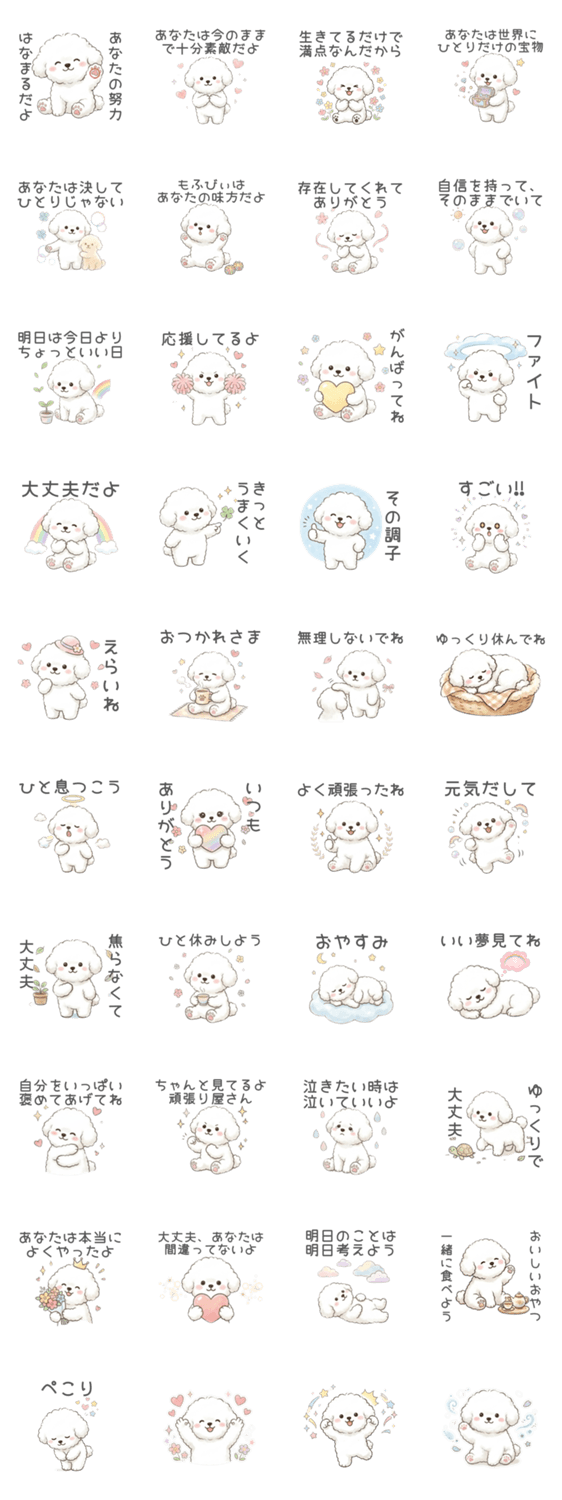 ふわふわ可愛い白ビションフリーゼ「もふびぃ」の、 心がほっとする応援&癒しスタンプ40個セット。 毎日使える優しいいたわりメッセージを考えました。