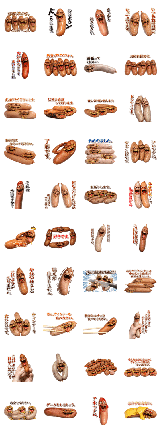 ホラーなウィンナーの敬語スタンプです。インパクト抜群。敬語、丁寧語ですので、誰にでも送りやすいですね。フランク、腸詰め、sausage、ソーセージ、変顔、キモい面白い