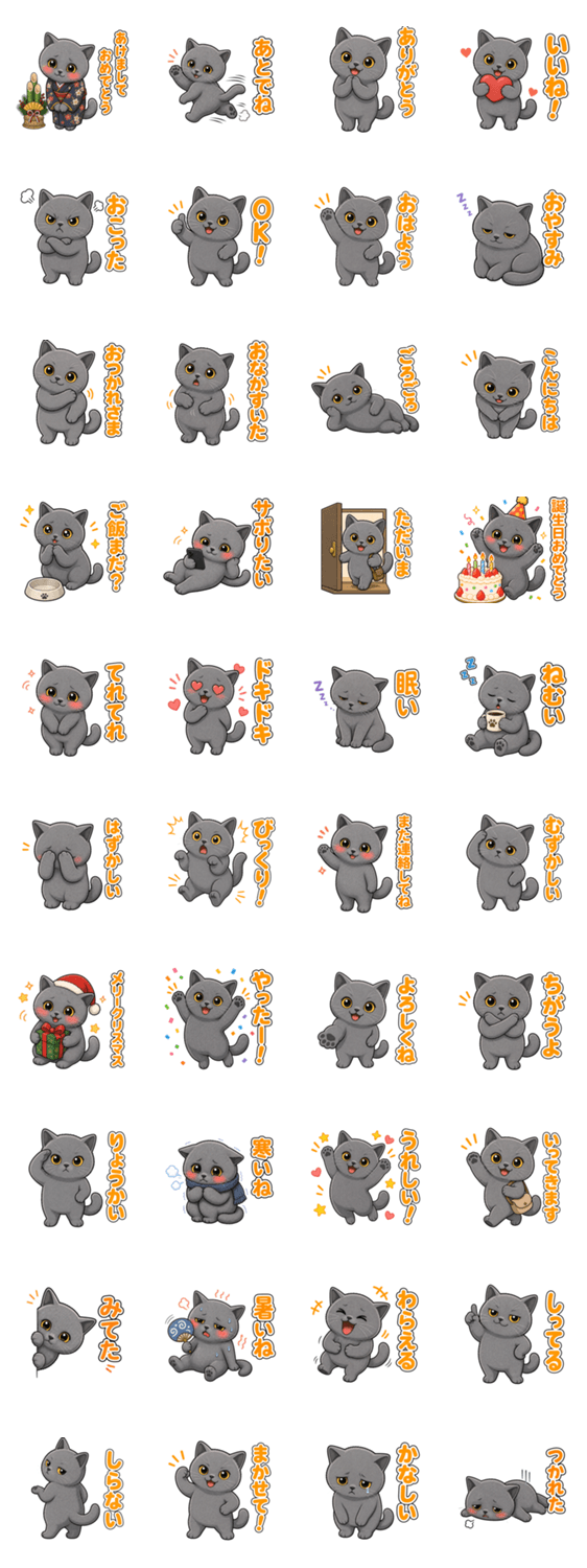 ブリティッシュショートヘアのグレー猫「ムン」が 日常のあいさつや気持ちを届けます♪ ゆるかわいいイラストで、トークをもっと楽しく!
