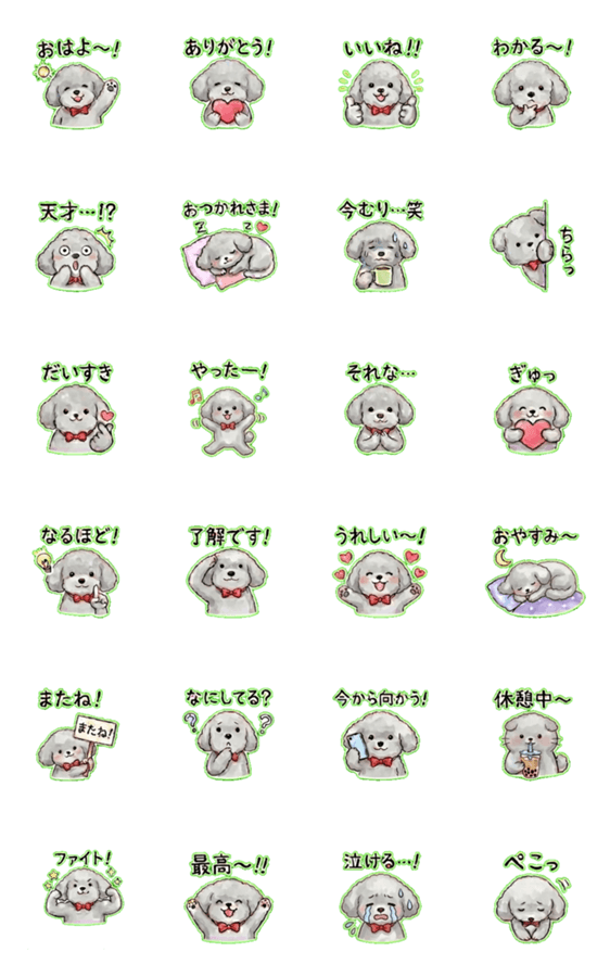 かわいいシルバートイプードルキャラ「シルバートイプードル」の日常スタンプ24枚。挨拶・感謝・共感など毎日のトークで使えるひとことを厳選。ほっこり気持ち