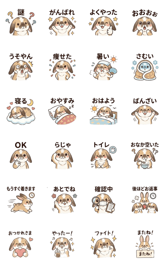 ホーランドロップのふるるが、日常のあらゆる気持ちを代わりに伝えてくれるスタンプです。うれしい・かなしい・眠い・やる気満々まで、毎日のトークで活躍します。