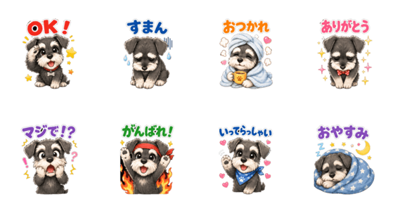 表情豊かなシュナウザーが、毎日の会話に彩りを。返事・お詫び・応援・お休みなど、相手やシーンを選ばず使える8種類のリアクションが揃いました。